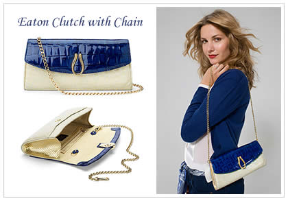 Choose from black patent croc, hot pink croc, brown patterned snake, gold snake and our favourite the Eaton clutch in blue and cream croc with gold snake.
