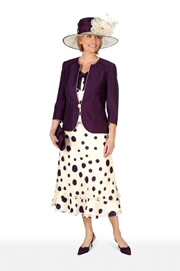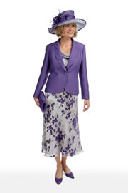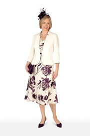 - Pretty Plum: Notch stand collar ivory jacket with satin inserts, Rosa Grande devore floral print pull-on dress, bias cut for drape.