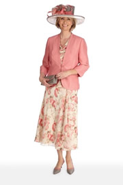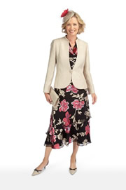 - Camellia: Fashionable corded one button jacket, tea rose top and print fully lined skirt with waterfall frill to the front.