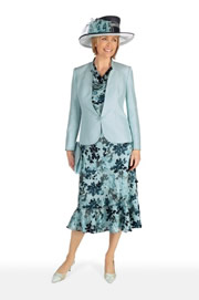 - Floral Silk: Misty aqua occasionwear jacket with shape enhancing seam detail front and back, Myriad dusty blue dress with cowl neck, frilly beaded hem.