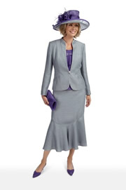 - Understated Elegance: Zirconia dart front jacket piped in silver, contrast layer chiffon top in amethyst and frill hem flared skirt with side back elastic.