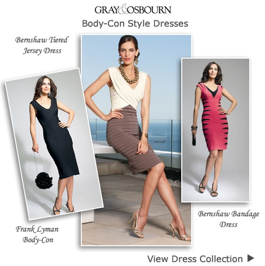 For all out glamour take a look at the designer collection of super sleek outfits from Gray & Osbourn. Here we came across a Frank Lyman Body-Con dress in a stretchy and supportive royal blue jersey. Other dresses we spotted include a Bernshaw one shoulder bandage dress, a figure hugging style with contrast insets and a tiered tailored dress with crossover bodice. Damsel in a Dress also has a stunning pull on ruched dress with a soft textured stretch fabric.