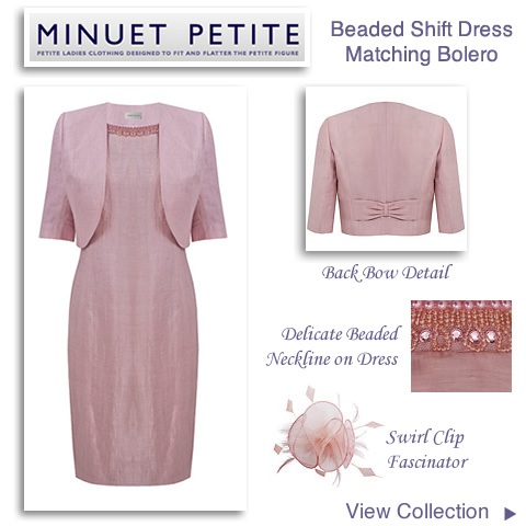 Pale hues in the softest shade of pink make for this season’s most sophisticated colour palette. Refresh your wardrobe and put the ooh back with new arrivals from Minuet Petite that include this fabulous two piece dress and bolero. For days when you need to make a style statement the timeless shift dress never fails to deliver. The soft pink tone and delicate beading adds a feminine touch to the classically cut outfit.