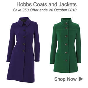 OFFER NOW EXPIRED Save £50 on a range of fabulous Hobbs and NW3 coats and jackets until October 24th 2010 You’ll find the latest autumn winter styles including funnel neck wool coats and jackets, tweed coats, animal print macs and military style trench coats.