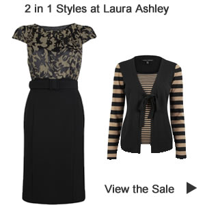 Offer now expired The Laura Ashley mid season sale continues until 3rd October with new items added. Two in one tops are a clever one piece design with a cardigan over a blouse or jumper. These stylish 2 in 1’s look good with the latest bootcut trousers which are also reduced by 25%. Included in the sale is this smart 2 in 1 dress with silk pattern bodice, plain black skirt and belt reduced from £100 to £75.00.