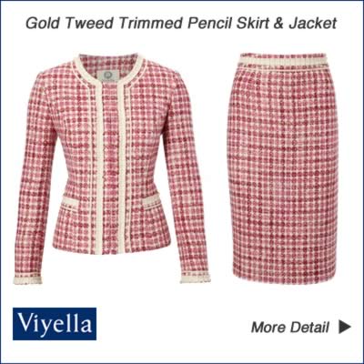 The classic look of the tweed suit has had a makeover ready for the new season. The soft shades of pink and cream soften the look of the textured fabric giving a total feminine appearance. The Gold Tweed Collarless Jacket can easily be worn with other skirts and trousers for a smart casual outfit. The matching tweed pencil skirt is just as versatile for wearing with separates, satin blouses or plain jackets.