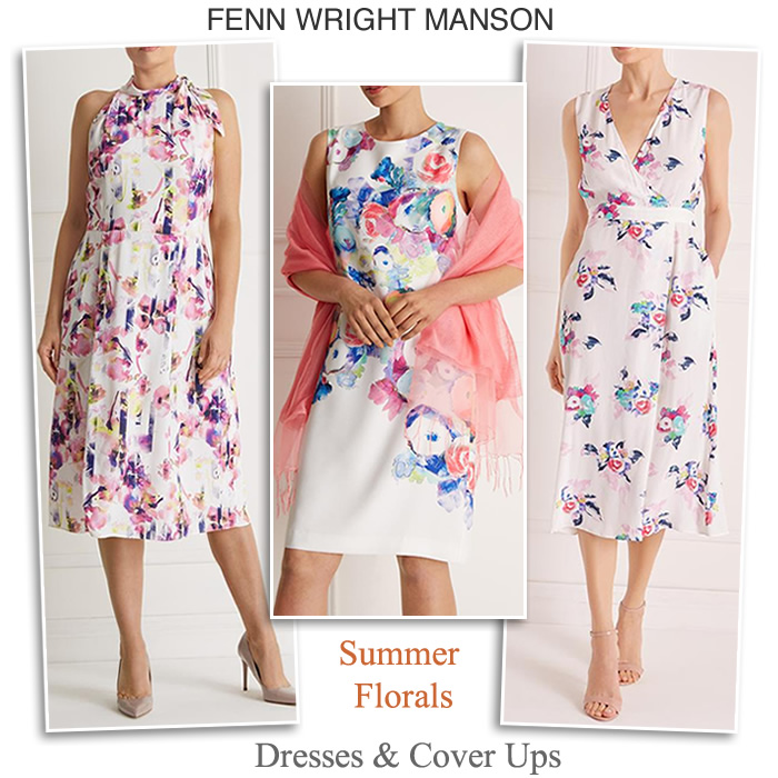 Fenn Wright Manson occasionwear. Sleeveless floral occasion dresses with matching scarf and cover-ups. Summer wedding outfits and race day dress styles with a halter neck and wrap-over bodice.